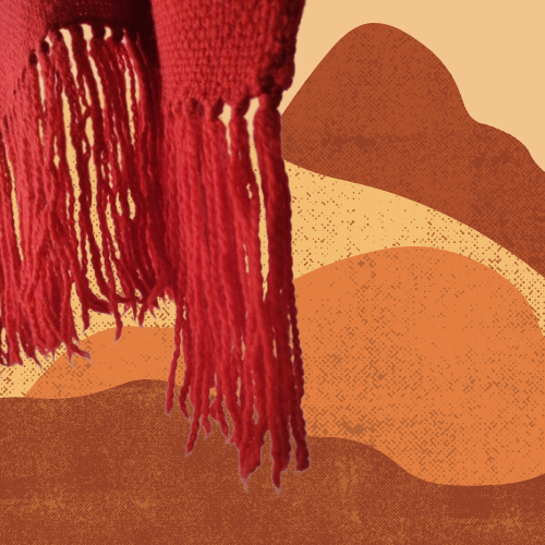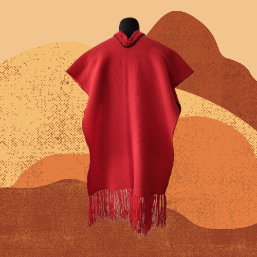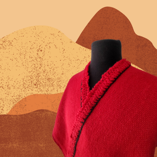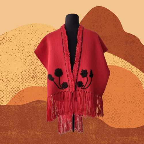 Ruana tejida en telar con fibras naturales de lana de oveja y bordada a mano con lana de llama de los Andes.
